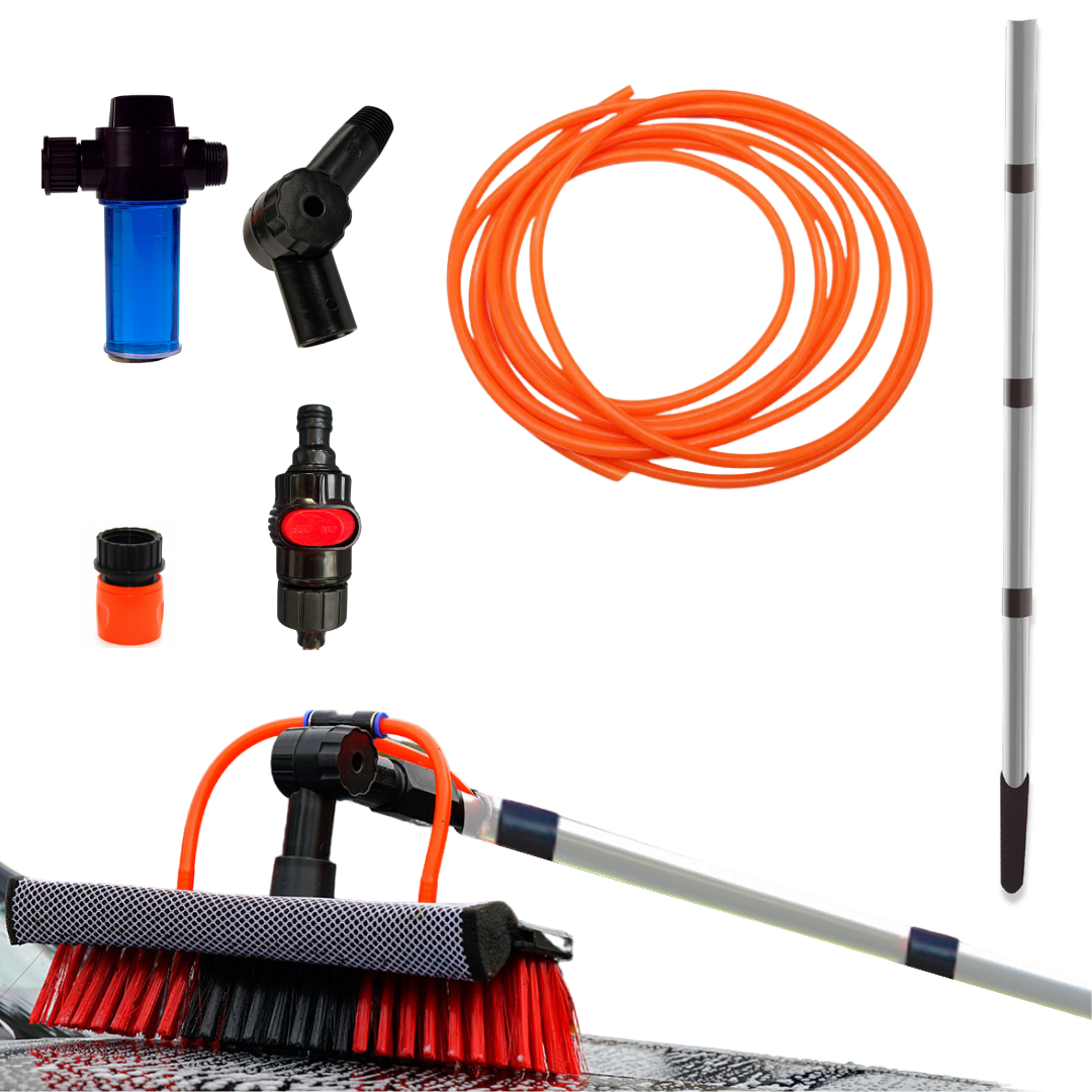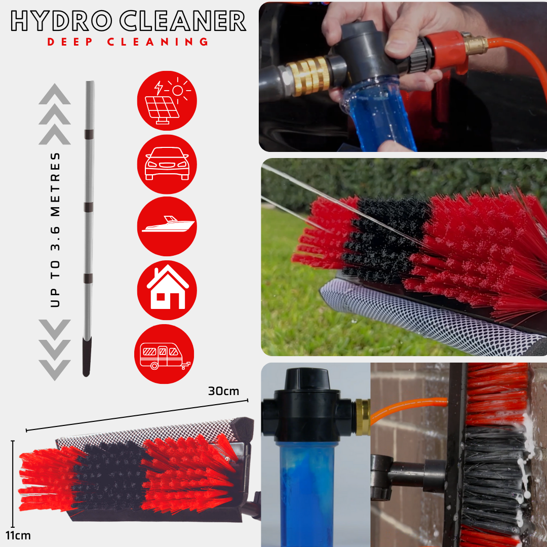 Hydro Cleaner es una herramienta innovadora que revoluciona la limpieza, eliminando la necesidad de usar básculas. Con un alcance de 3,6 metros, permite acceder a lugares difíciles como ventanas altas, paneles solares, muros cortina de vidrio, techos de casas, coches, camiones, motocicletas, fachadas y caravanas, ofreciendo una solución completa para la limpieza en altura de forma segura y eficiente.