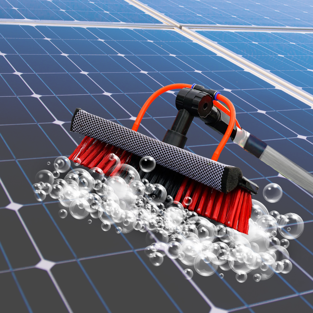 El cepillo está equipado con un sistema de suministro de agua y un dispensador de spray que facilita la eliminación de la suciedad más persistente. La combinación de agua y jabón permite una limpieza profunda y eficiente, eliminando residuos y manchas difíciles de diversas superficies. Esta característica lo hace ideal para limpiar ventanas, paneles solares y otras áreas que requieren una limpieza meticulosa.